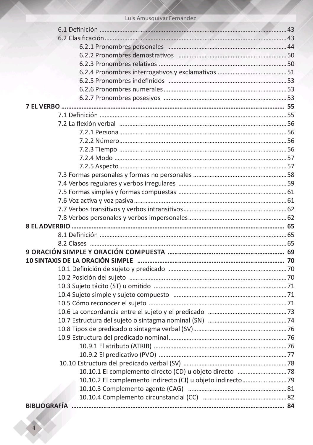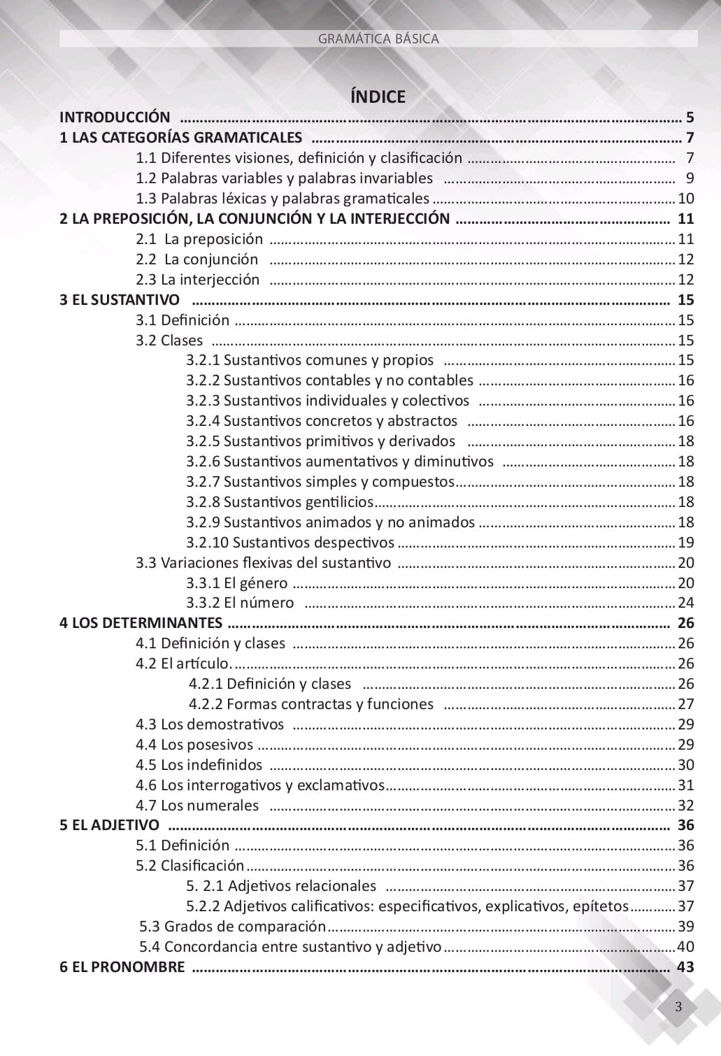 El texto ofrece suficiente teoría y mucha práctica y está enfocado para necesidades complejas de escritura desde la normativa de la Real Academia Española. Se explica de manera general las categorías gramaticales y más específica con las clases de palabras desde el punto de vista morfológico: la preposición, la conjunción, la interjección, los determinantes, el adjetivo, el pronombre, el verbo y el adverbio. Posteriormente, se ofrece una visión sintáctica de la oración simple y compuesta y más específica de sus elementos: sujeto, predicado.