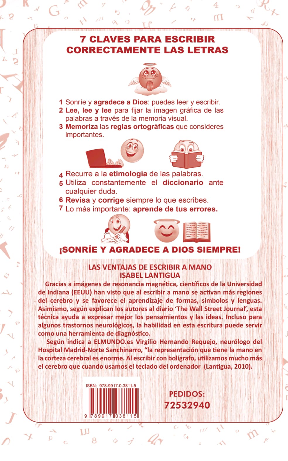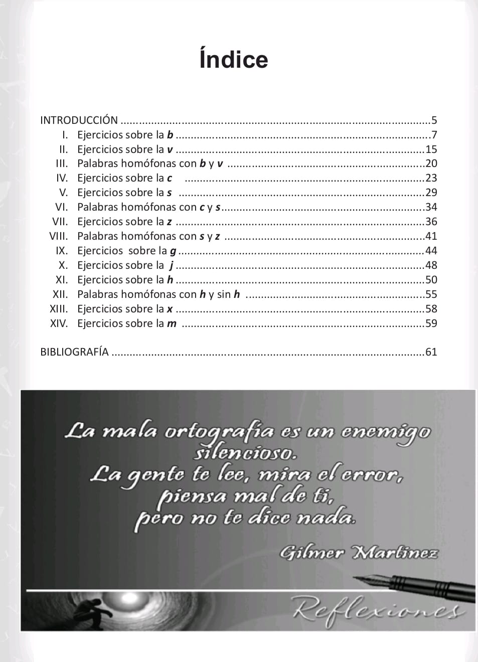 El texto ofrece suficiente teoría y mucha práctica y está enfocado para necesidades complejas de escritura desde la normativa de la Real Academia Española. Se concentra en las reglas del uso de la b, v, c, s, z, h, j, x y m; también se explican las palabras homófonas. El texto brinda abundante ejercicio de manera que se pueda utilizar algunas reglas y desarrollar la memoria visual para escribir correctamente.